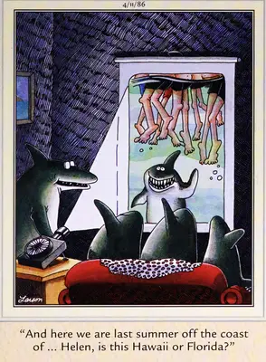 Presentar una presentación de diapositivas de su viaje de verano, Algunos tiburones pueden parecer divertidos para los invitados, pero muestran fotos horribles a los humanos. Mostrando una foto de uno de ellos frente a un grupo de piernas, el tiburón se pregunta si fue tomada en Hawai o en Florida.