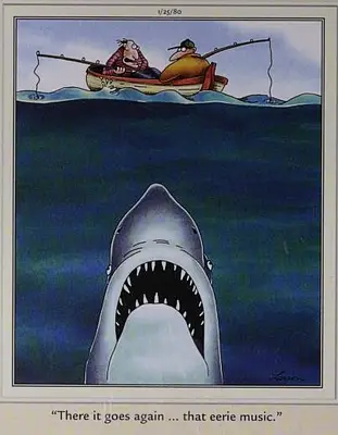 Dos pescadores se encuentran con música misteriosa. Está listo para masticar a lo grande. Use imágenes clásicas de películas de verano 顎 Y su tema icónico y de suspenso, Lado lejano Dibujar imágenes peligrosas con las que todos están familiarizados 顎 La película es fácil de entender.