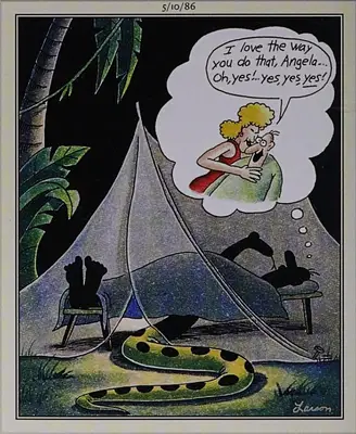 El hombre tiene algunos dulces sueños mientras acampa en una tienda de campaña. Parte de esto es gracias a las pistas externas que recibimos del mundo exterior. Pensando que es besado por una chica especial en su vida, Está a solo unos centímetros de la serpiente gigante como la de Anaconda que realmente lo come .