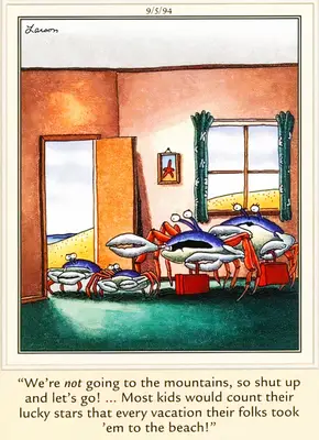 Las familias de cangrejos están en su lugar para las vacaciones de verano en la playa, pero al igual que las vacaciones de verano humanas, los niños no siempre son los más agradecidos. En una tira cómica, El padre de cangrejo ladra a los niños No es que vayan a las montañas para las vacaciones de verano, a pesar de sus solicitudes y quejas. En cambio, se quedan en la playa.