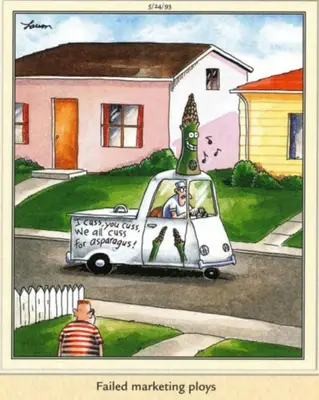 Todos gritamos por helado en el verano, pero Farside imagina una delicia muy diferente de un vecino. En lugar de camiones de helado, los camiones de comida que sirven asparagos rodan por la calle , todos están decepcionados.