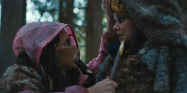 Natalie enmascarada, amenazando a Hannah (Ashley Sutton) con una participación en Yellowjackets Temporada 3 EP 10